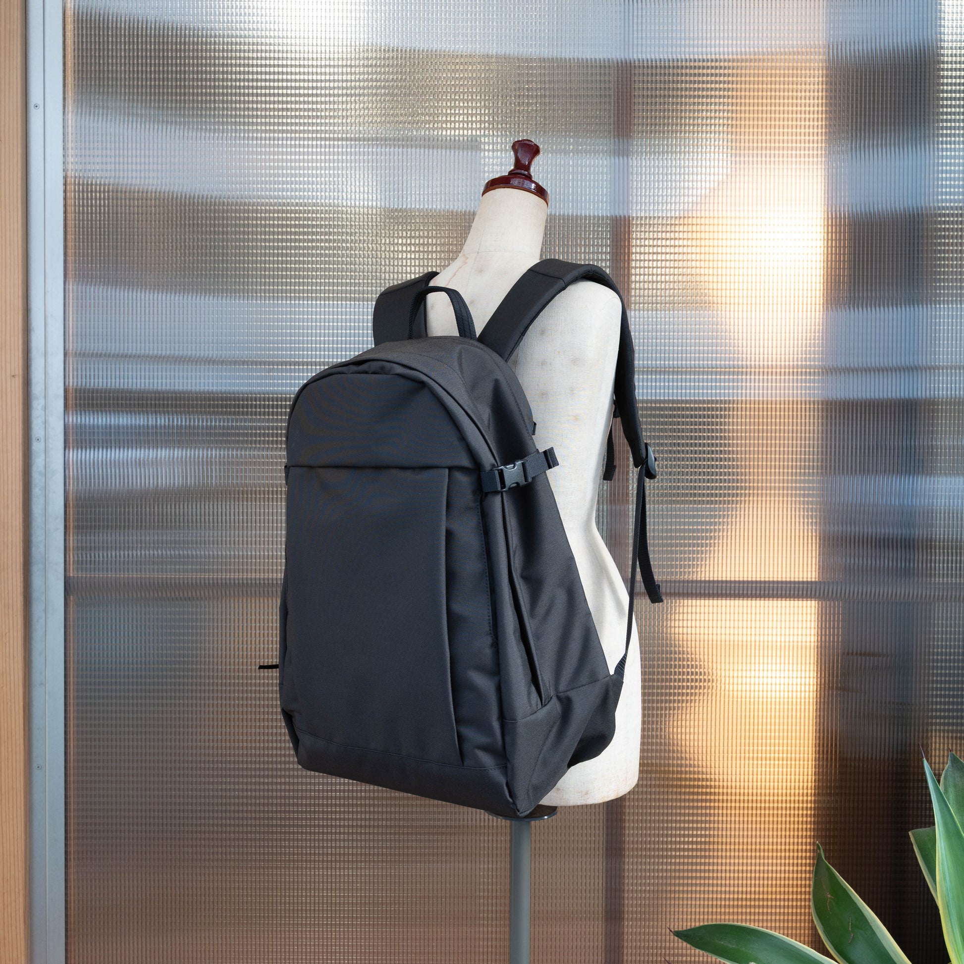 背面からメイン収納部にショートカットできるファスナーやチェストストラップのショルダー周りのパーツなど特徴的な機能は比翼によって覆い隠されています。メインファスナーの開閉時、煩わしくもあるサイドバックルはデザインに緩急をつけ、背面のショートカットポケットが機能を引き立てます。