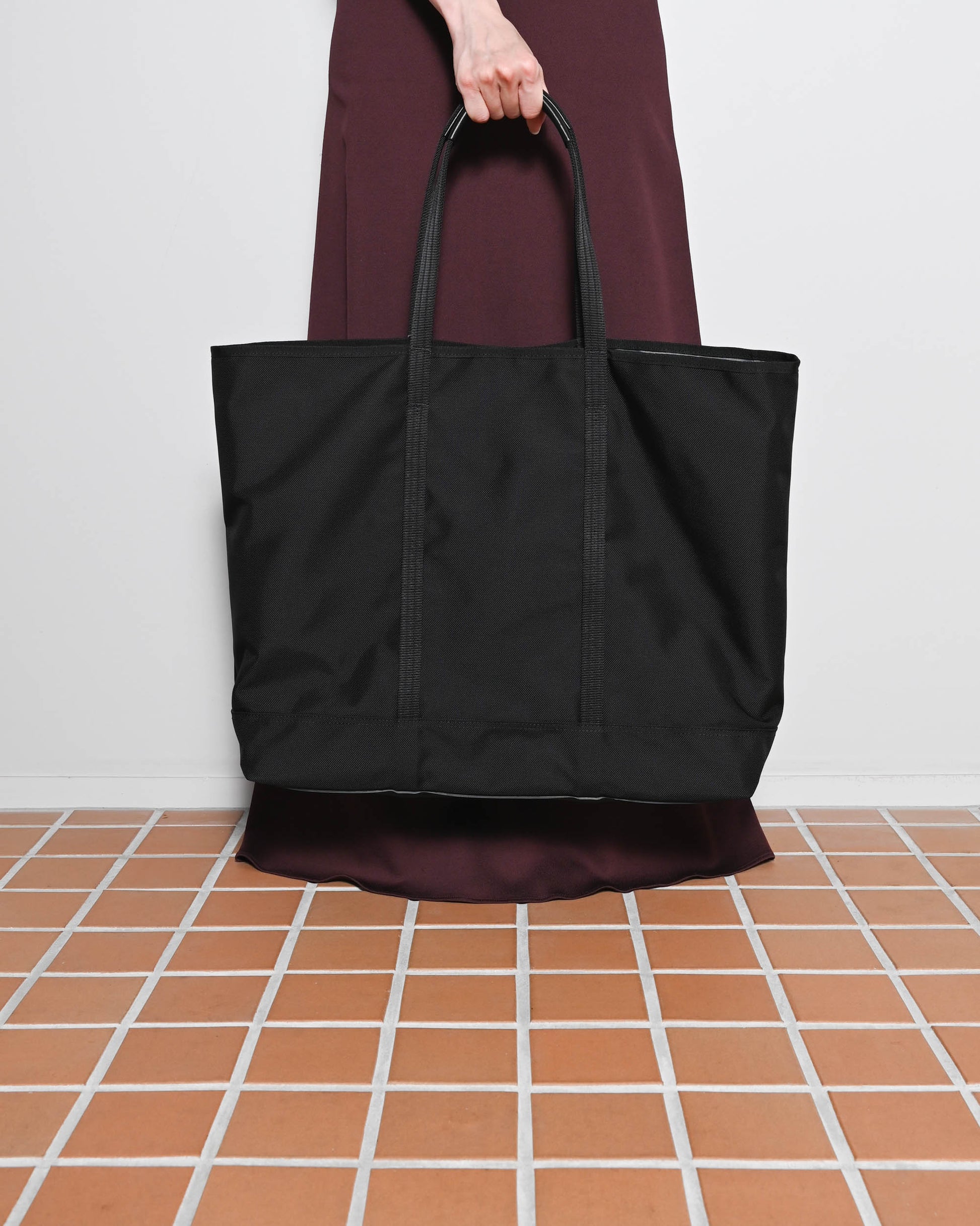 1680d×840dの強靭なコーデュラナイロンを素材にした大きめのトートバッグは程よい光沢があり上品な印象です。底はビブラムシートで切り替えて耐久性を上げています。38mmのナイロンテープを二つ折りした細めの取手はコシがあって反発が強く、トートバッグの自立に一役買っています。取手の手に触れる部分は革で補強し、握り心地もとてもよいです。マチが広いにも関わらず舟形ではなくスクエアな印象を与えるためにパターンに工夫を凝らしています。