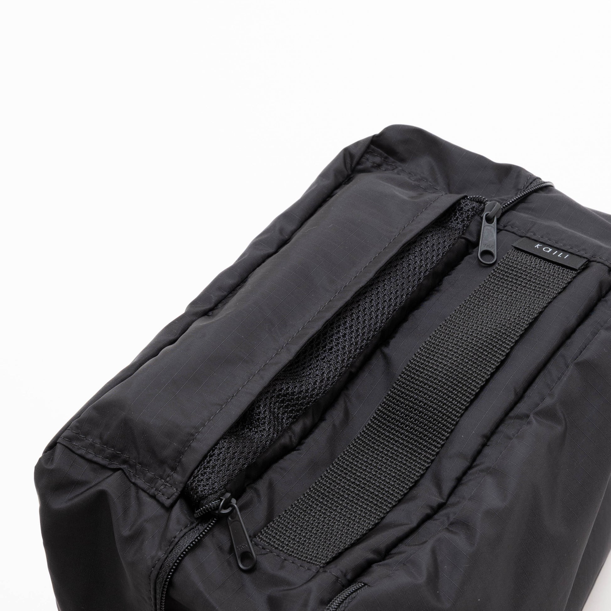 表裏一体型のトラベルポーチ。CLEAN側(メッシュ側)から衣類を取り出し、使用済みの衣服は裏側のDIRTY側に収納します。DIRTY側に衣類が全て移動するとCLEAN側のメッシュの蓋をポケットに収納することでDIRTY 側の容積が倍になります。